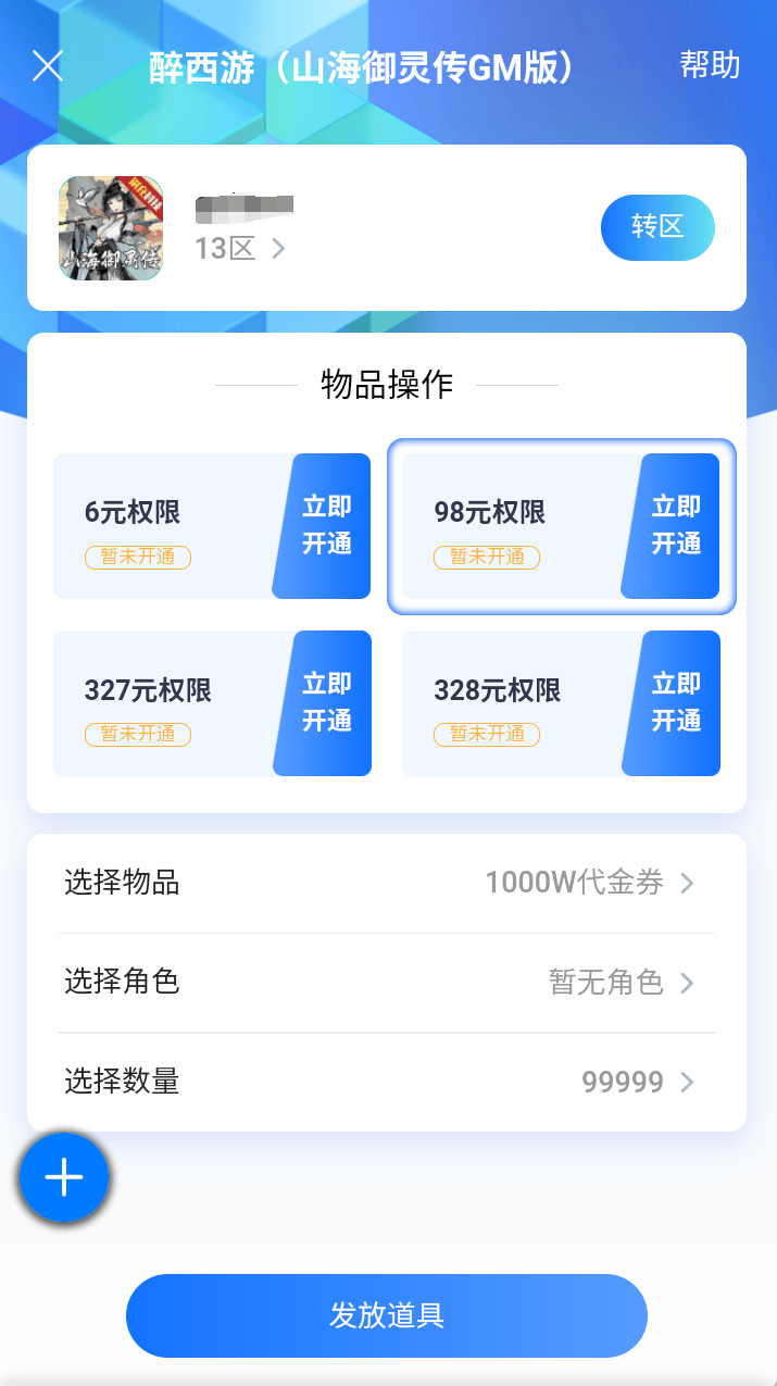 打开盒子,进入对应GM游戏的后台界面,选择区服,核对账号,然后点击对应权限后面的“立即开通”按钮,支付完毕返回后台界面即可操作发放道具(比如先开通10元权限,如需开通50权限,则点击50权限后面的立即开通,会自动抵扣差价,只需再付40即可)